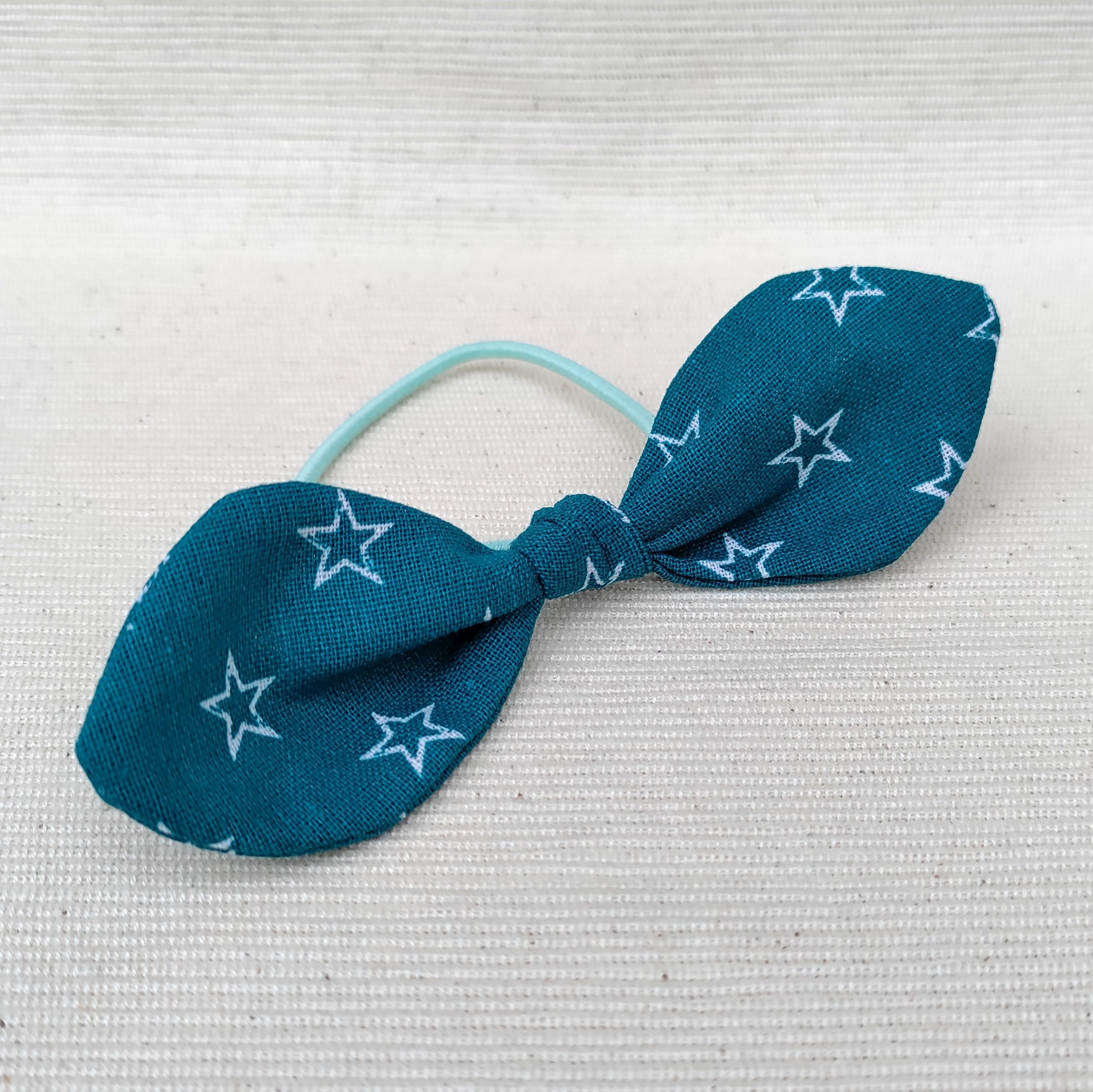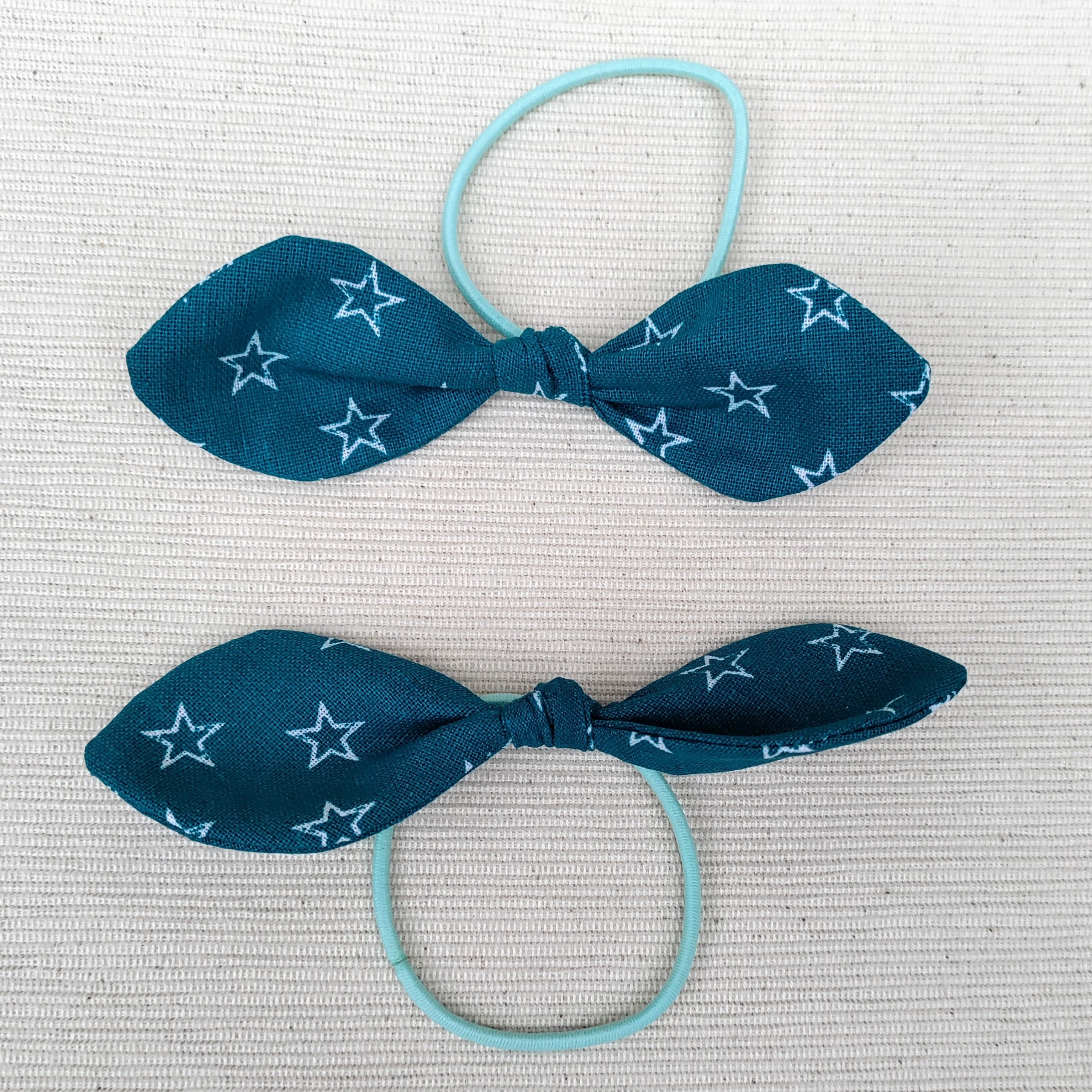 Each fabric bow measures approximately 11cm from tip to tip and is knotted to a 5cm diameter coordinating hair bobble, 2mm thick.