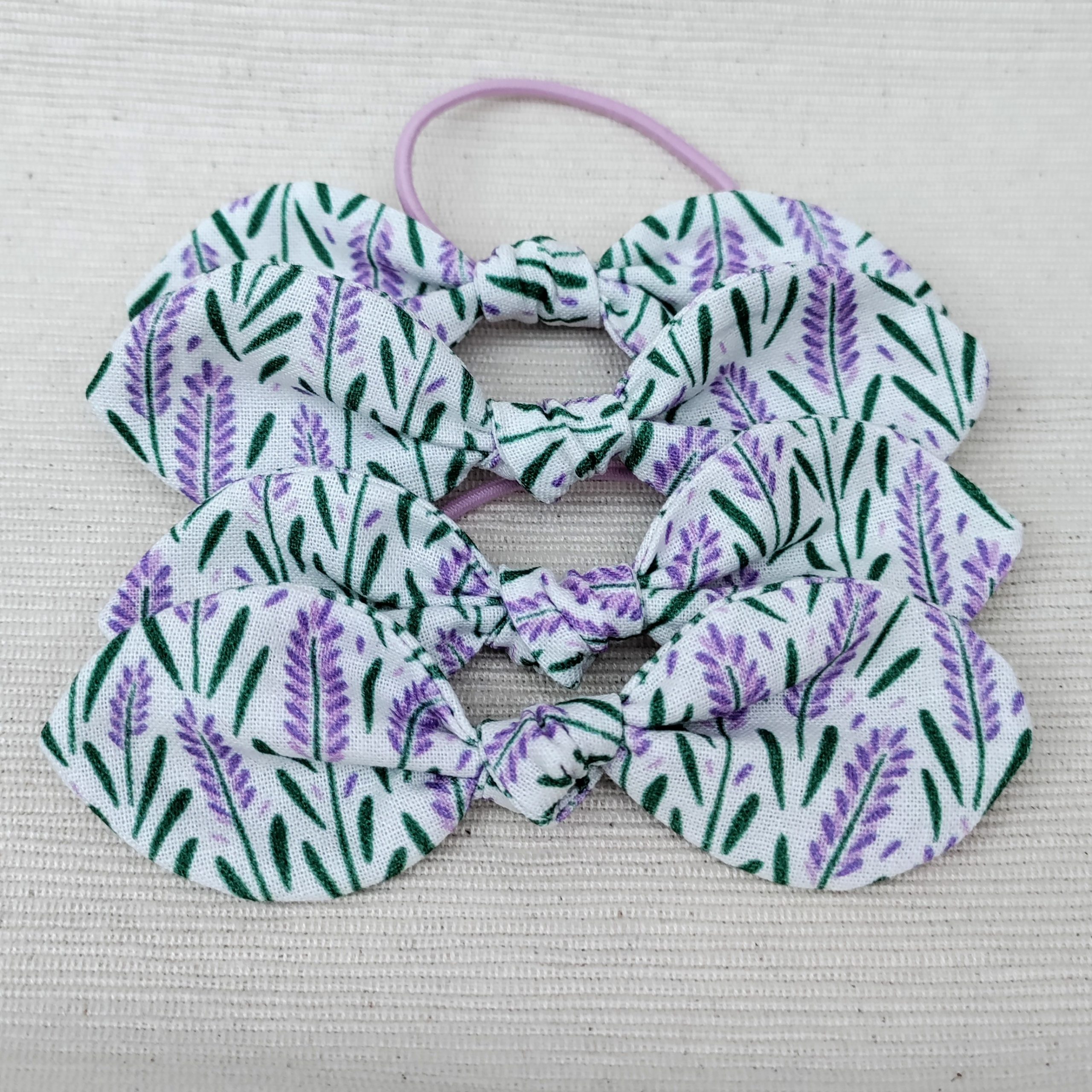 Each fabric bow measures approximately 10cm from tip to tip and is knotted to a 5cm diameter coordinating hair bobble, 2mm thick.